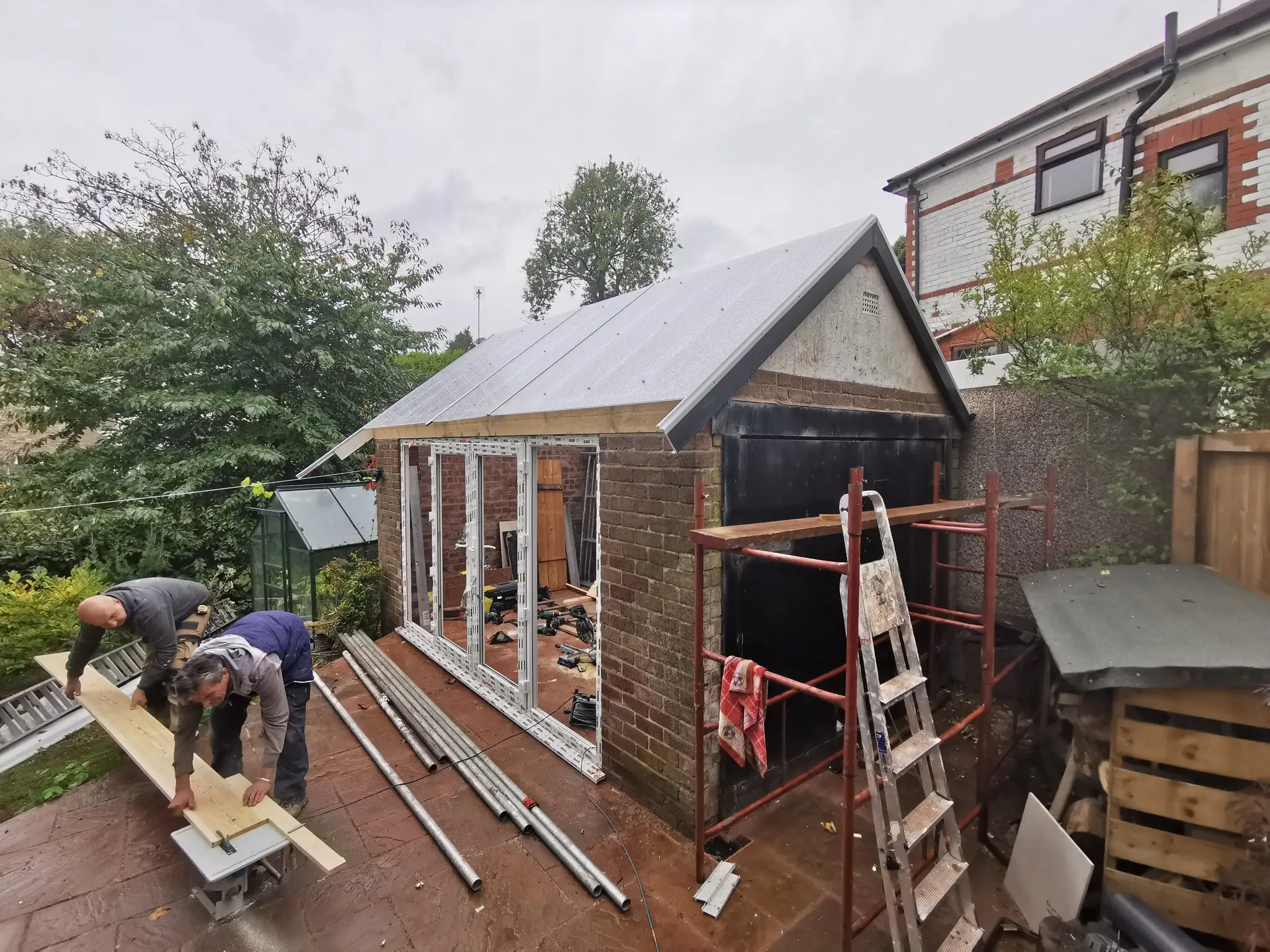 - Transformation of the garage into a new living space, with a new roof, French doors, and electrics